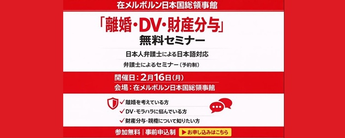 「離婚・DV・財産分与」無料セミナー【在メルボルン日本国総領事館】
