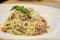 6. ボールに、スパゲッティー二と4、バジルペースト、松の実を入れてよく混ぜ、パルメザンチーズ、ガーリックチップス、レモン汁をかけて供します。