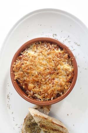プリプリのえびとオリジナルのサルサソース、フェタチーズをオーブンで焼いた一品。