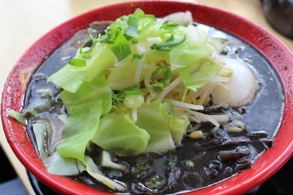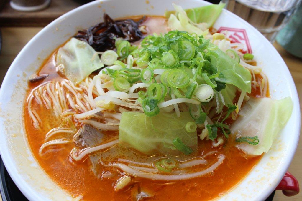 この店だけのスパイシーな赤ラーメンをオーダー。相方は黒ごまの味が生きた黒ラーメン。