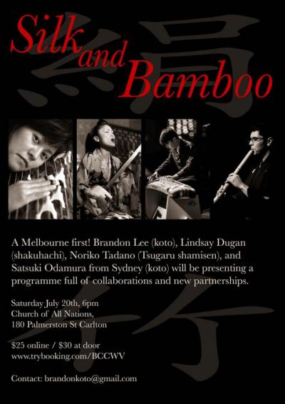 メルボルンを拠点に活動する琴奏者 Brandon Lee、尺八奏者 Lindsay Dugan、津軽三味線奏者 只野徳子、
