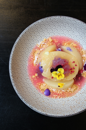 食事の最後を飾るのは、淡いピンクの色合いのSakura + Momo。日本の白桃の瑞々しい甘さ、甘酒の濃厚な風味、桜のジェ ルが一体になったサッパリとした日本の春を感じさせるデザート。