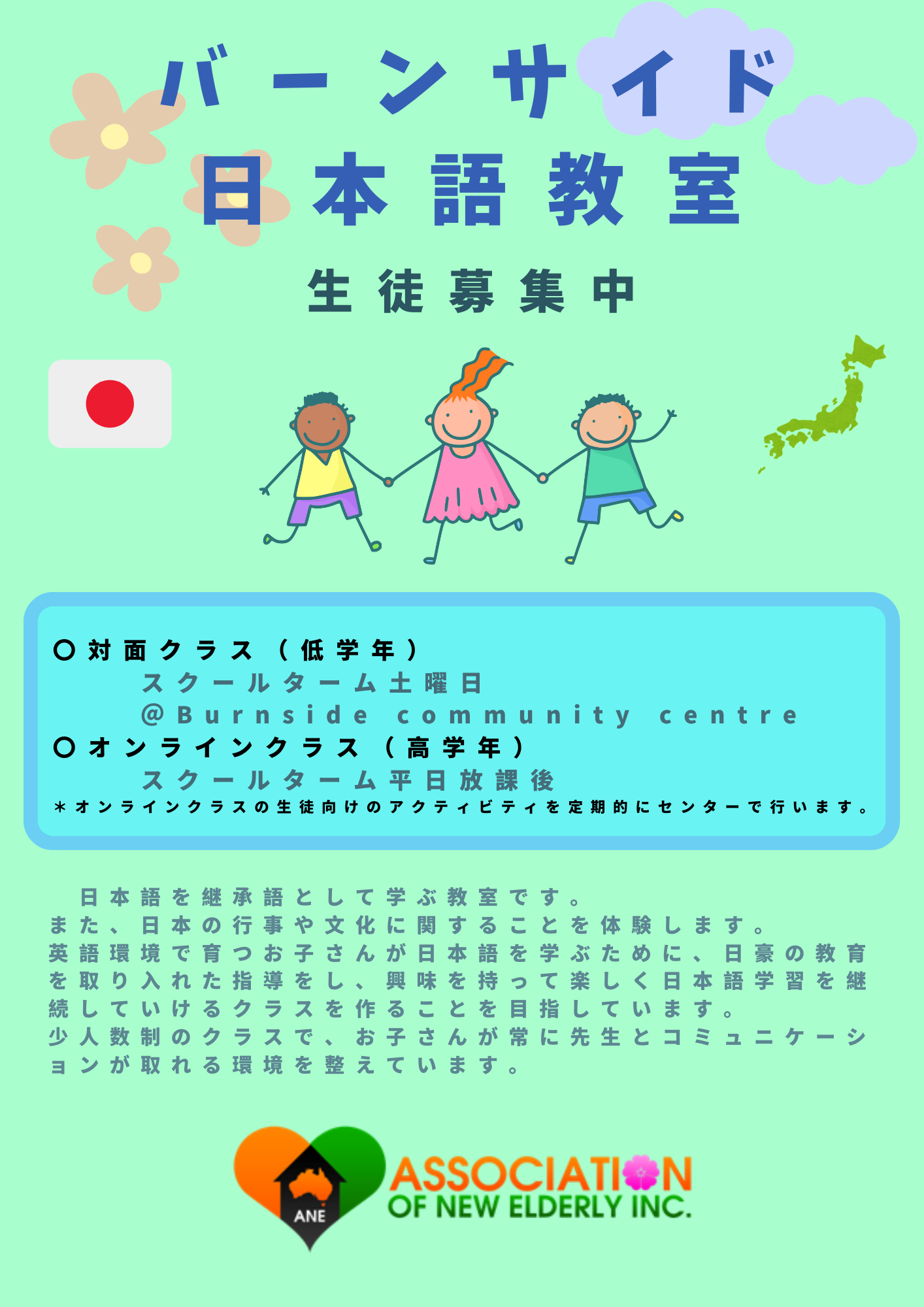 *日本語教室はAssociation of New Elderly Inc(非営利団体)の活動の1つで、受講料は必要経費をカバーするために使われており、営利を目的とした活動ではありません。