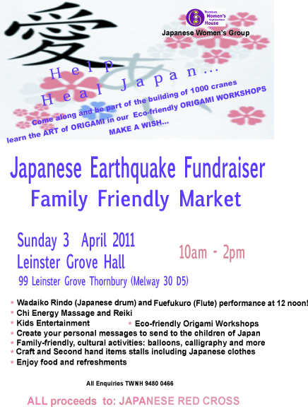 この度メルボルン北部の日本人女性のソーシャルグループ(Japanese Women Social Group)がTMNH(Thornbury Women's Neighbourhood House <http://www.twnh.vic.edu.au/twnh/> の協力のもと今回の東日本大震災にて被災された方々を支援するためのチャリティーイベントを企画しました。収益金はすべて日本赤十字社に寄付させていただきます。ぜひご家族、お友達お誘いあわせのうえご来場ください。